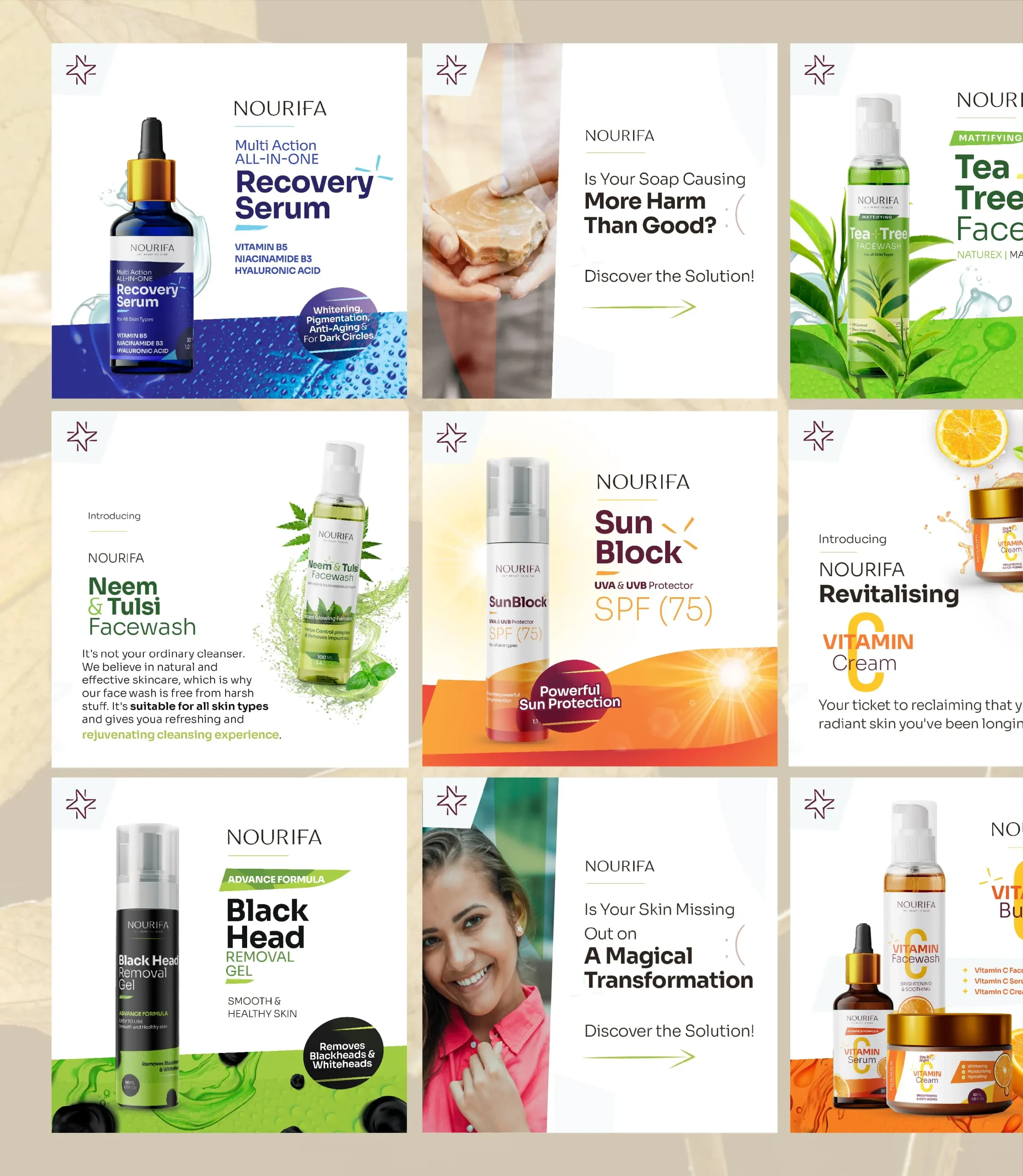 Nourifa’s brand identity and marketing materials work together to position the company as a leader in natural skincare.